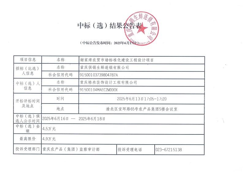 謝家灣農(nóng)貿(mào)市場室內(nèi)裝飾工程招標(biāo)比選公告1. 招標(biāo)比選條件重慶供銷生鮮連鎖有限公司謝家灣農(nóng)貿(mào)市場室內(nèi)裝飾工程,招標(biāo)人為重慶供銷生鮮連鎖有限公司,資金來自業(yè)主自籌資金,...